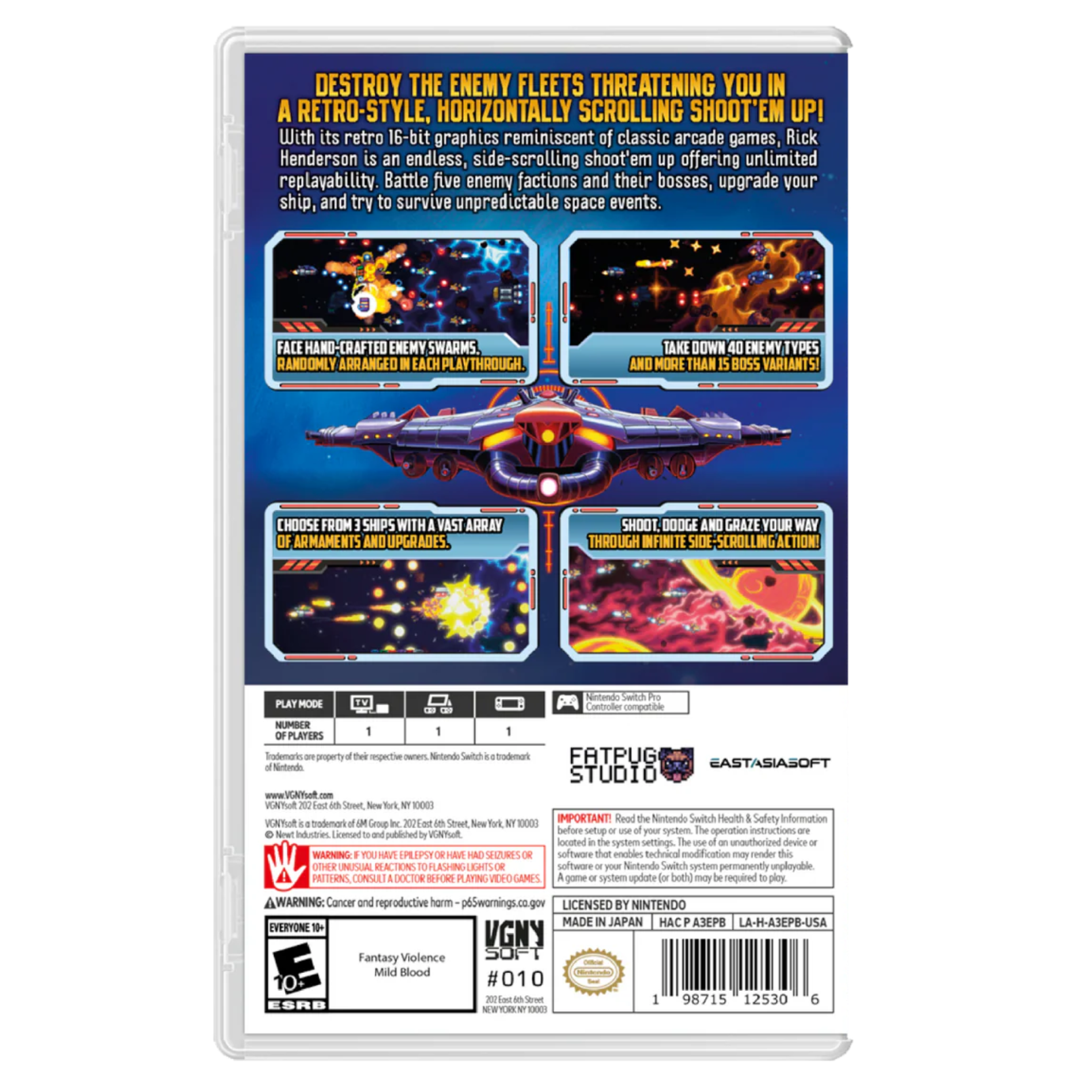 Paying homage to arcade classics with nostalgic 16-bit graphics, Rick Henderson is an endless horizontal-scrolling shoot-'em-up packed with infinite replayability. Blast through five unique enemy factions and their formidable bosses, upgrading your ship to survive unpredictable and chaotic space events.